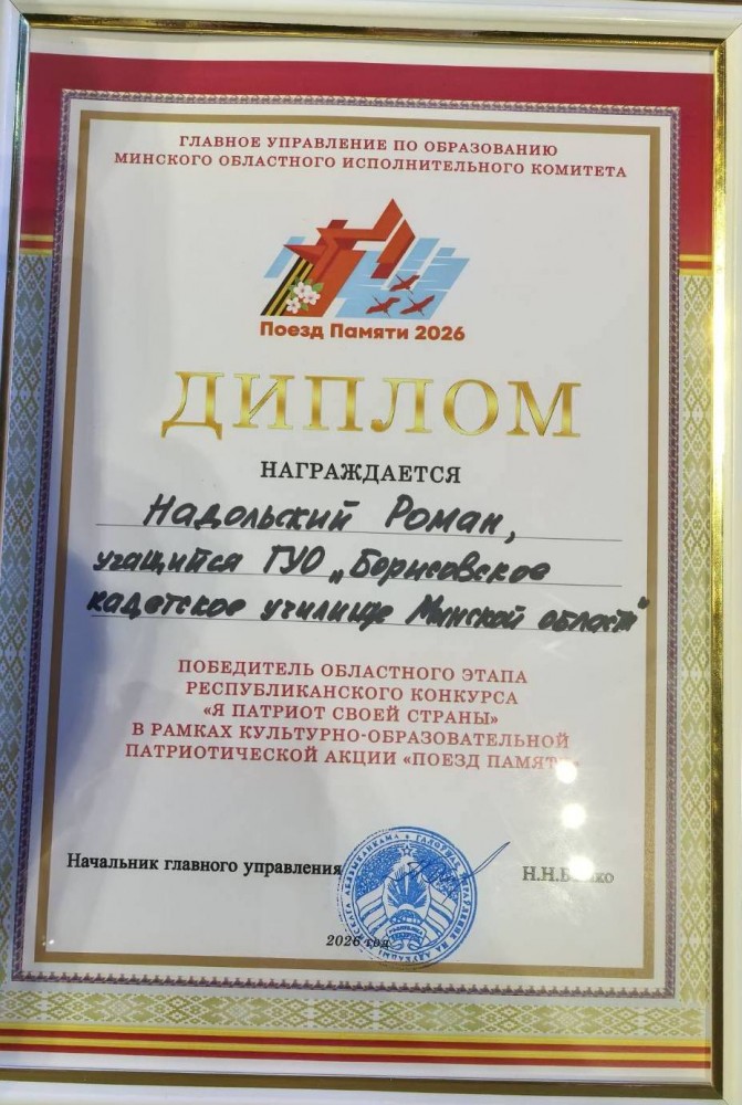 Кадет 3 курса ГУО «Борисовское кадетское училище Минской области» Надольский Роман принял участие в областном этапе республиканского конкурса «Я патриот своей страны», который прошел в средней школе № 4 г. Столбцы 20 марта 2026 года. Победителям были вручены дипломы, книги «Национальное достояние Беларуси», а также подарки от Белорусского детского фонда. По итогам областного тура на республиканский этап отправятся 15 школьников, среди которых и Надольский Роман. Поздравляем!