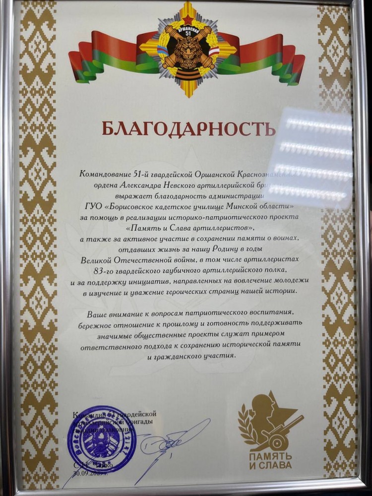 Сохранение памяти о воинах, отдавших жизнь за Родину в годы Великой Отечественной войны, бережное отношение к прошлому и готовность поддерживать значимые общественные проекты, является одной из приоритетных целей деятельности Борисовского кадетского училища.