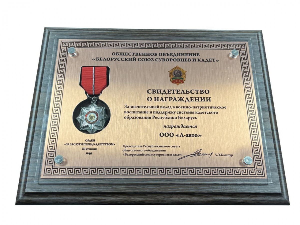 Общественное объединение «Белорусский союз суворовцев и кадет» наградило компанию «Л-авто» орденом «За заслуги перед кадетством lll степени»